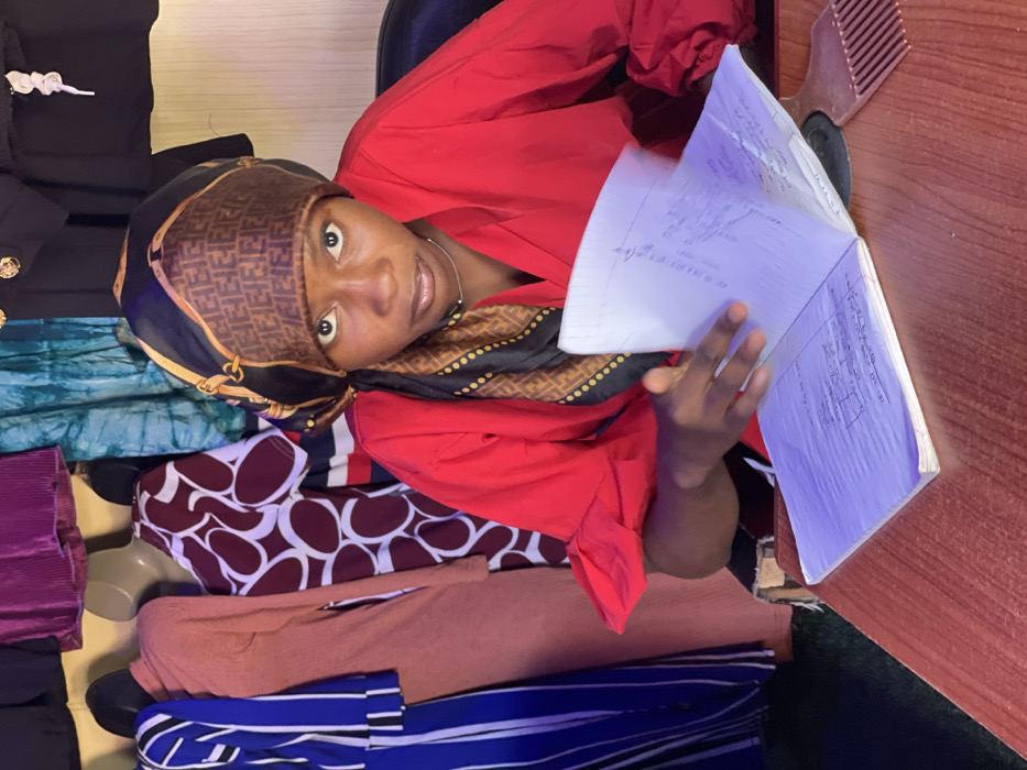 The image depicts an indoor scene, likely a retail clothing establishment in Samaru, Nigeria. A dark-skinned individual is seated behind a reddish-brown laminate desk, looking directly at the camera with a neutral expression. The individual wears a bright red long-sleeved shirt with wide cuffs and a dark headscarf patterned with gold interlocking 'F' logos and chain motifs. A thin, silver-colored necklace is visible. The individual's left hand rests on an open white notebook displaying handwritten text and diagrams. A dark brown hair pick is positioned on the desk to the individual's right. The background consists of various garments displayed on mannequins and hangers against a light-colored wall, including a blue and white striped dress, a solid peach-colored dress, a maroon dress with white oval patterns, a purple pleated top, a blue and green tie-dye fabric, and black garments.