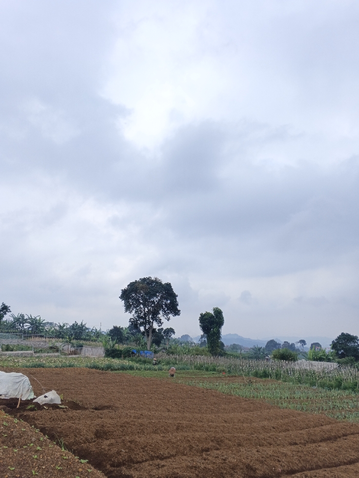 A landscape shot reveals a cultivated field of reddish-brown earth with rows of green crops. In the distance, trees punctuate the horizon under a cloudy sky. A large, leafy tree stands prominently, alongside smaller trees and vegetation. A partially covered object is in the lower-left corner. Two distant figures appear to be working in the field, adding a human element to the scene. The overall impression is one of rural activity and overcast weather.