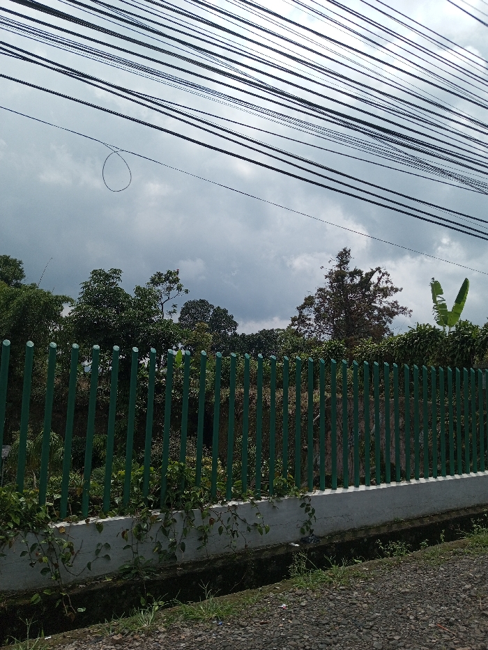 This image depicts an outdoor scene in Batulawang, Indonesia, characterized by a predominantly green and grey palette under an overcast sky. In the foreground, a dark, gravelly ground surface is visible. Immediately beyond this, a concrete drainage ditch runs horizontally across the bottom of the frame. Above the ditch, a low concrete retaining wall supports a fence composed of numerous dark green, vertical cylindrical posts, approximately one meter in height, topped with rounded caps. Green vines with small leaves are growing along the concrete wall and some extend onto the fence posts. Behind the fence, dense tropical vegetation fills the midground, consisting of various trees and shrubs with lush green foliage. A distinct, broad banana leaf is visible on the far right, extending above the general canopy line. Further back, taller trees rise against the skyline. The background is dominated by an overcast sky filled with dark grey clouds. Multiple black utility lines, approximately 10 to 12 in number, run horizontally across the upper third of the image, appearing as parallel strands against the sky. A single black, circular object, possibly a looped wire or debris, is suspended in the air in the upper-left quadrant, between two of the utility lines. No people, animals, or specific actions are observed in the frame.