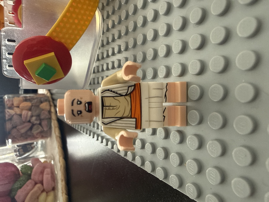 The scene depicts an indoor, domestic environment. The specific location within Limeil-Brévannes, France, is not discernible from the visual information provided. A Lego minifigure stands centrally on a light grey Lego baseplate. The minifigure features a light nougat complexion, with a printed facial expression showing wide eyes and an open mouth. It is attired in a tan tunic with a dark brown collar, a white vest with vertical stripes, white trousers with a jagged black pattern at the lower edge, and an orange sash around the waist. Its light nougat hands are positioned slightly forward. To the right of the minifigure, partially obscured by a translucent plastic container or barrier, is a yellow Lego arm element connected to a red circular Lego piece, which in turn features a yellow square Lego piece topped with a smaller green square Lego piece. In the background, on the left, a dark brown surface, likely a table, is visible. On this surface, a clear glass jar contains numerous small, irregularly shaped confectionery items or nuts in shades of brown, grey, and orange. To the left of the jar, a cluster of pastel-colored candies (pink, green, yellow) rests on a light-colored woven mat. The background elements are partially out of focus.