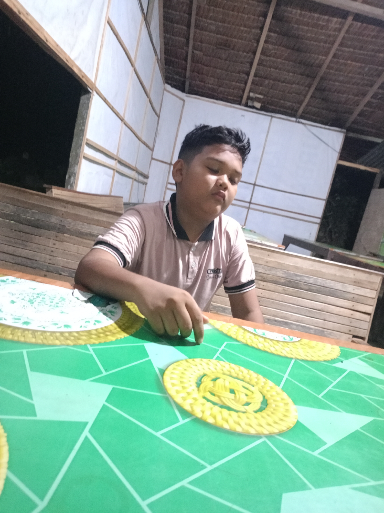 A young male, appearing to be a child or early teenager, is seated at a table within a semi-enclosed structure in Lhokseumawe, Indonesia. He wears a light pink short-sleeved polo shirt with a black collar and black trim on the sleeves, featuring a small logo on the left chest. His eyes are directed downward or partially closed. His right hand rests on a yellow, circular, woven placemat. The table is covered with a green mat displaying a geometric pattern of light lines. Two yellow woven placemats and a partially visible white placemat with a green pattern are present on the table surface. The background consists of walls framed with light-colored wooden slats supporting white paneling or fabric, and a ceiling made of dark, woven natural material, likely thatch, supported by wooden beams. To the left, a dark, open rectangular space, possibly a doorway or window, is visible above stacks of unrefined wooden planks. Artificial lighting illuminates the scene.