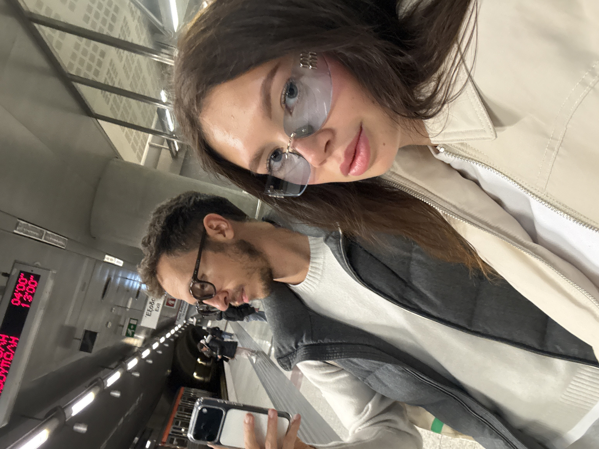 The image captures two individuals at an underground metro station in an unknown city. A young woman, with brown hair and light-colored glasses, is positioned in the foreground, seemingly taking a selfie with a man beside her. The man, who has short brown hair and a beard, is wearing glasses and looking down at a smartphone he is holding. They are standing on the station platform. Behind them is the metro tunnel, along with other people and metro cars, and a digital display showing arrival times is visible.
