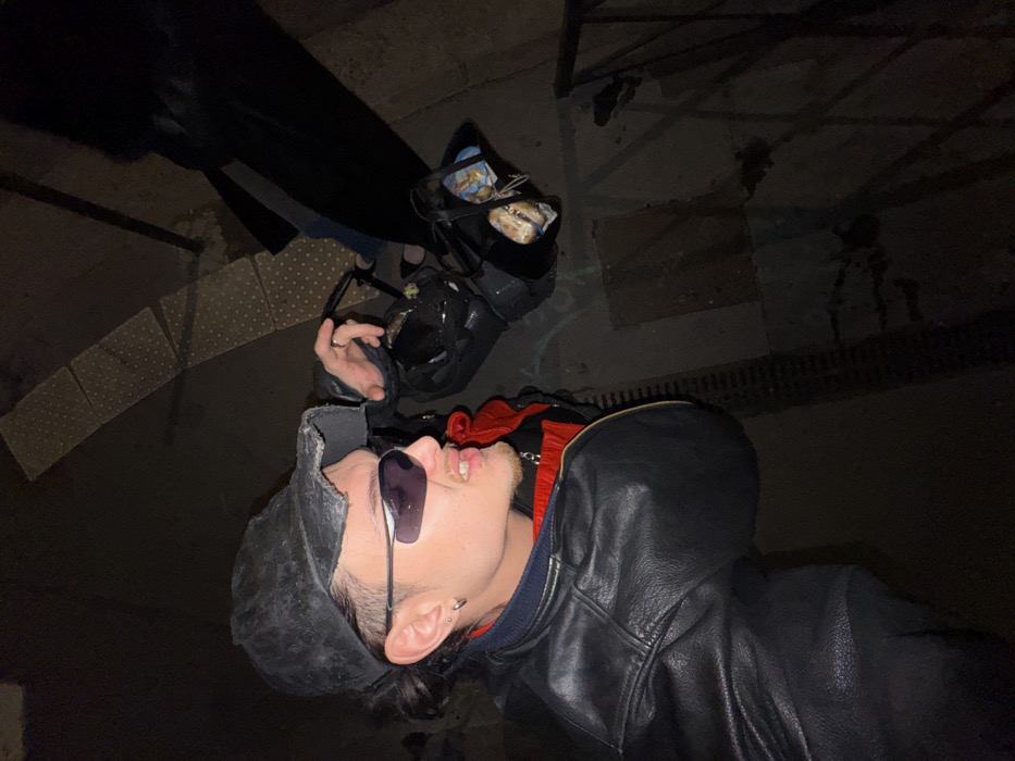 The scene depicts two individuals at night or in a dimly lit environment in Asnières-sur-Seine, France. The primary subject, positioned in the foreground to the left, is a young male with light skin and dark hair styled as a mullet, visible beneath a heavily distressed black baseball cap with a torn brim. He wears dark wraparound sunglasses, a black leather jacket with a blue collar detail, over a red inner garment. A silver-colored chain is visible around his neck, and he has a silver stud earring in his left ear and a silver-colored ring on his right hand. His mouth is slightly open, revealing teeth, and he has a faint mustache and goatee. He is angled to the viewer's left, looking to his right, and holds a black helmet with his right hand, resting it near his hip. A second individual is partially visible to the right, from the waist down, wearing dark clothing, possibly trousers or a skirt, and dark shoes. This person holds a black handbag containing light-colored items, which appear to be packaged goods. The ground surface is dark, appearing to be paved or concrete, with distinct sections of raised, circular-patterned tactile paving visible in the upper and lower right portions of the frame. Metal railings are partially visible in the lower right. The overall lighting is dim, suggesting a nighttime setting, with a direct light source illuminating the primary subject.