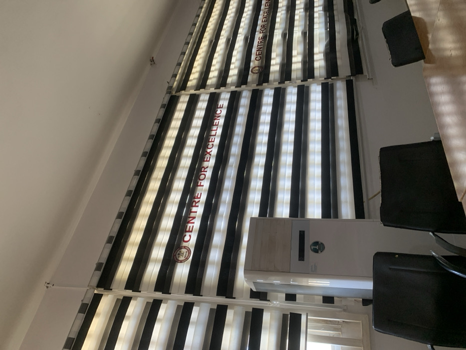 The image captures an interior scene within a building in Bukuru, Nigeria. The room features a wall dominated by multiple windows fitted with horizontal striped blinds, alternating black and translucent white sections. Each blind prominently displays the red text "CENTRE FOR EXCELLENCE" alongside a circular logo, positioned across the lower black strips. A tall, white, floor-standing air conditioner unit, showing surface discoloration on its upper front, is situated in front of the leftmost visible window. In the foreground, the backs of two black office chairs with armrests are partially visible, positioned at a polished light-brown wooden table. The walls and ceiling are a uniform light color. No individuals or specific actions are present in the scene.