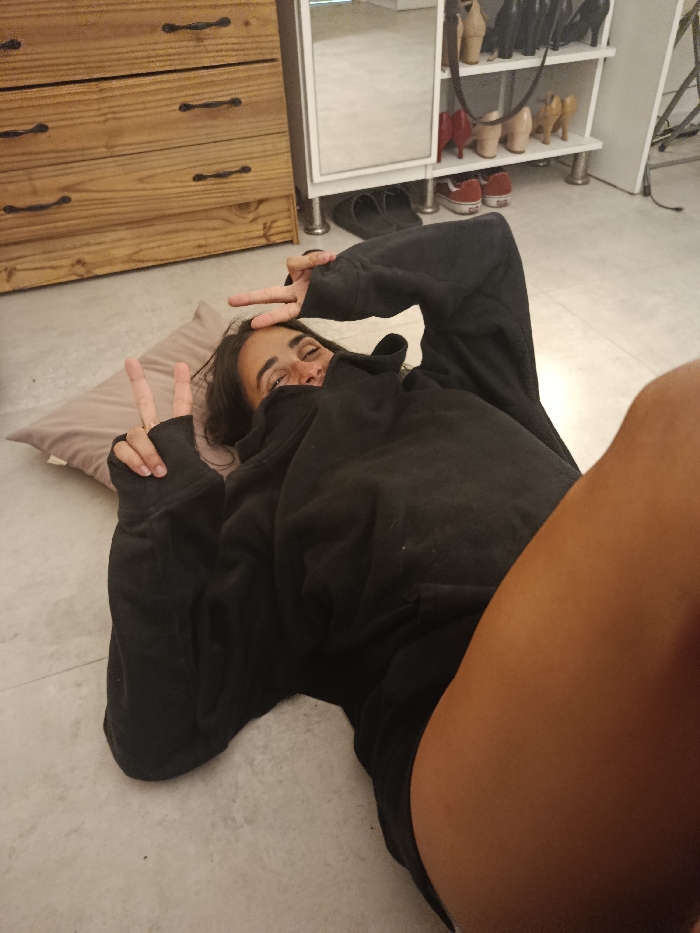 A woman in a black hoodie lies on a beige pillow on a gray tile floor. Her face is partially obscured by the hoodie, but her eyes are visible, and she makes a peace sign with each hand. A wooden dresser with metal pulls is visible on the left, and a white cabinet with a mirror and shoes is behind the woman. The front of her leg is in the foreground, showing her dark tan skin.