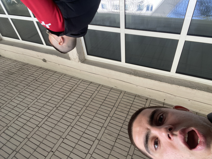 The image depicts two males in Sofia, Bulgaria, viewed from an upward-angled perspective. In the upper-left quadrant, a young adult male's face is directed towards the camera, with a wide-open mouth and wide eyes. He has short, dark hair. A horizontal, light-colored concrete beam crosses the mid-section of the image. Below this beam, a second male is partially visible in the lower-right quadrant, seen from behind and his right profile, from the mid-chest upwards. He wears a black sleeveless puffer vest over a red long-sleeved shirt with a white cross emblem on the right sleeve. He has short, dark hair and wears light-framed glasses. His head is turned towards the right. The background features large, white-framed multi-pane windows, reflecting a clear blue sky, bare tree branches, and parts of an adjacent building. Above the concrete beam, a light-colored, rectangular-tiled ceiling or overhang is visible.