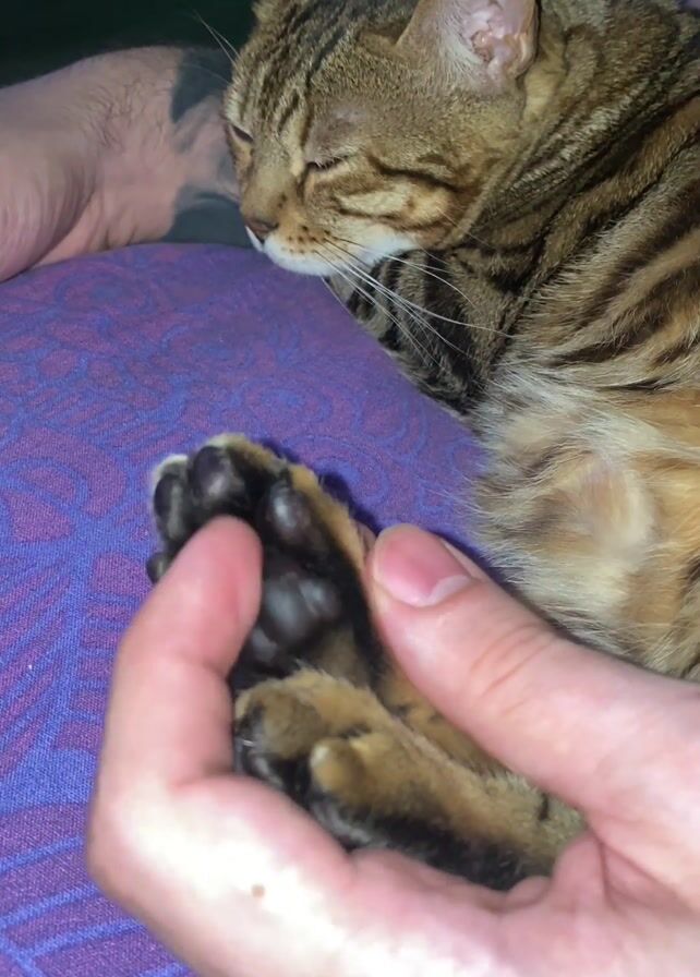 A close-up shot shows a tabby cat lying on a purple surface, seemingly resting. A person's hand is holding one of the cat's paws, gently manipulating its toes. The cat's eyes are mostly closed, but it appears aware of the touch. The person's hand is pale, with short nails, and there is a tattoo visible on the lower arm. The surface the cat is lying on has a subtle geometric pattern. The lighting is somewhat dim, suggesting the scene may be indoors.