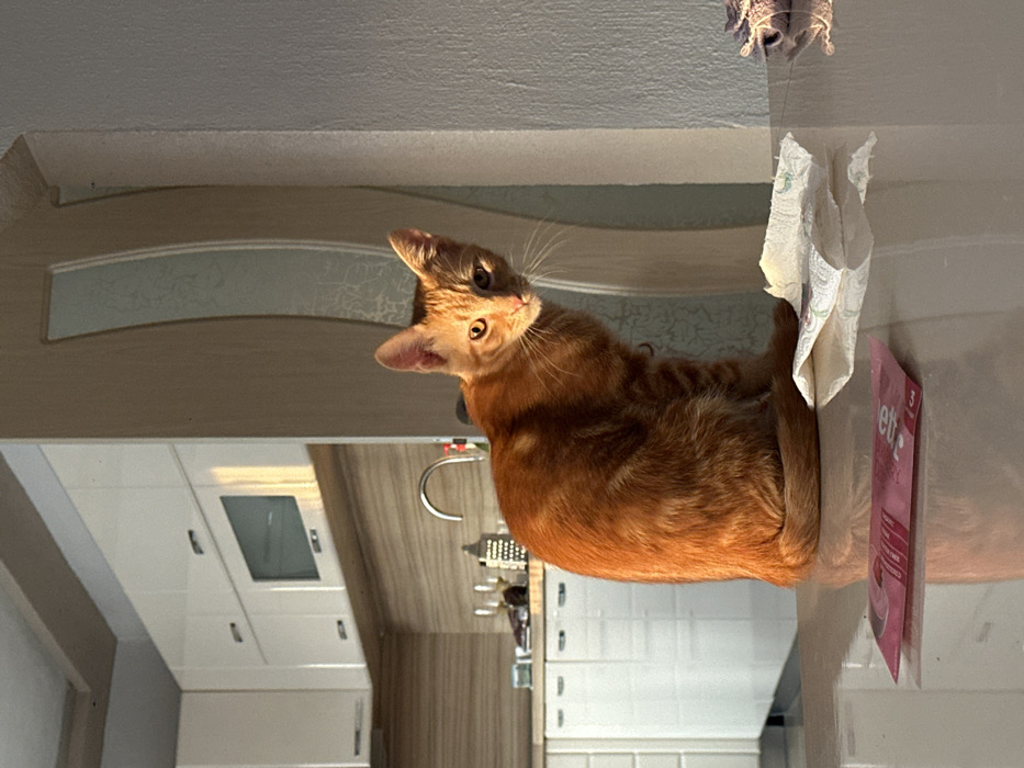 An orange tabby cat is seated on a reflective, light-colored surface, likely a table or countertop, in an indoor domestic setting within the city of Petrich, Bulgaria