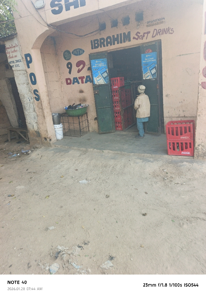 The image depicts a small storefront with "IBRAHIM SOFT DRINKS" painted above the entrance