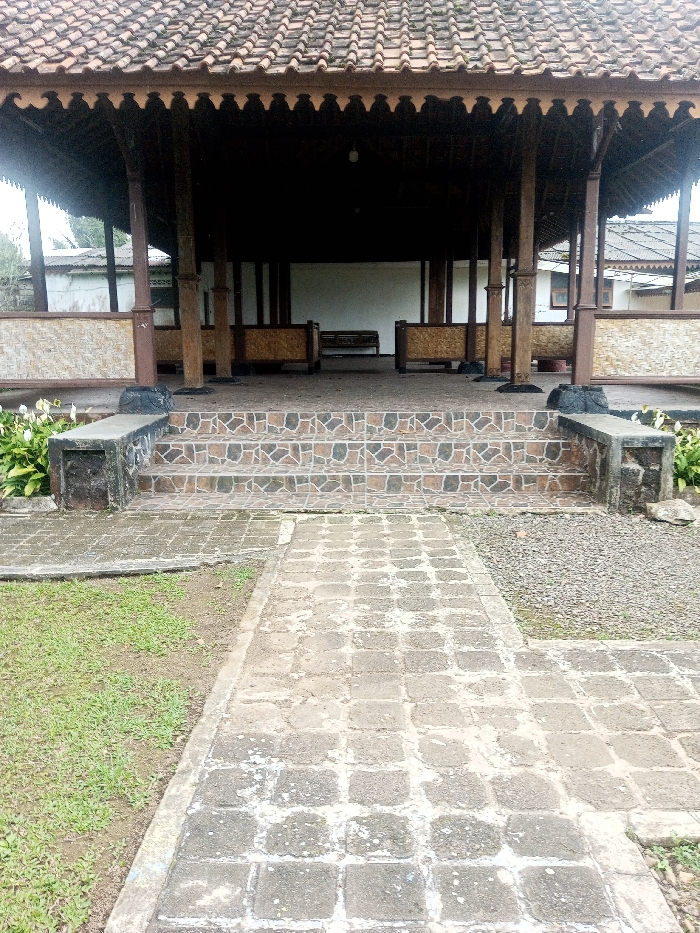 The image depicts an outdoor covered structure, likely a pavilion or part of a building, situated in Nghĩa Đồng Commune, Vietnam. A greyish-brown paved pathway, composed of square concrete or stone blocks and exhibiting signs of wear and moisture, extends from the foreground towards the structure's entrance. To the left of the pathway is an area of sparse green grass with visible soil, while to the right is a section covered with small, grey gravel. Three steps lead up to the structure's elevated floor. These steps are surfaced with irregular, multi-toned brown, tan, and grey tiles. Flanking the steps are low concrete retaining walls or planters; the one on the left contains green foliage with white spathe-like flowers. The structure features a dark brown tiled roof with an overhanging eave detailed with a decorative, scalloped wooden trim. Multiple dark wooden posts support the roof and define the open-sided space. The perimeter of the structure is lined with waist-high barriers or railings, constructed from light-colored woven material (likely bamboo or rattan) set within dark wooden frames. The interior is shadowed, revealing a dark wooden bench positioned further back. Beyond the structure, elements of other weathered buildings, including one with a corrugated metal roof, are visible in the background. No individuals, actions, or interactions are present in the scene.