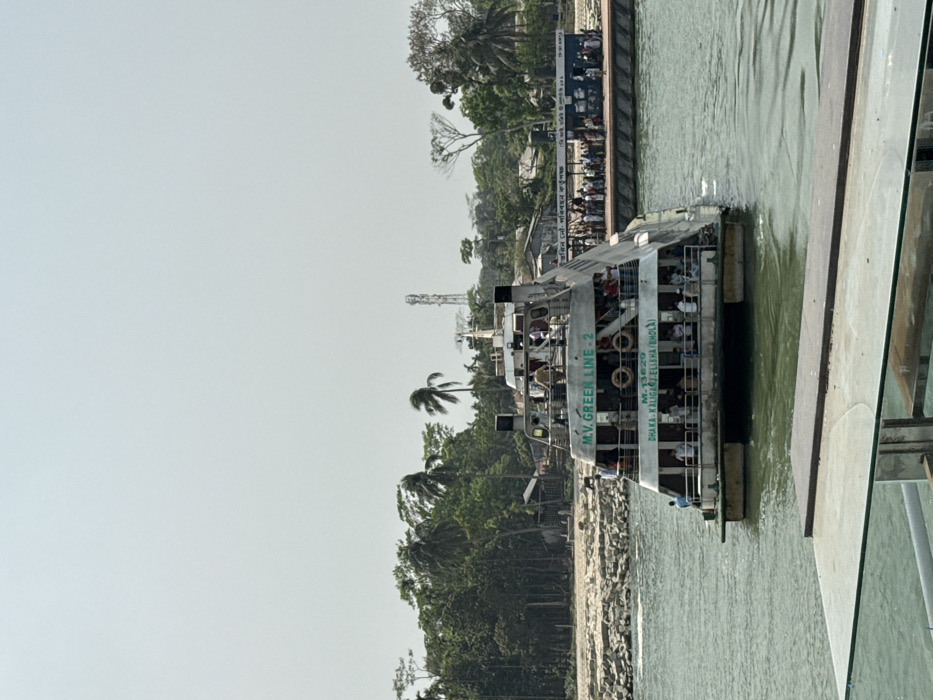 white ferry boat named "M.V. GREEN LINE-2" leaving a dock in the city of Harni, Bangladesh, located at latitude 22.859 and longitude 90.613. The ferry boat is departing from the dock, moving away from the shore towards the middle of a body of water. The vessel has a number of passengers onboard, and is marked with the words "DHAKA KALIGANJ ELLISHA (BMOLA)" on the side. There are multiple people standing on the dock, many of whom appear to be waving goodbye to the ferry boat. The dock is made of concrete and lined with a stone wall. Behind the dock is a small, densely forested area. The sky is light blue and cloudless, and the water is a calm, light blue. The scene is viewed from a higher vantage point, likely from a building or another structure.
