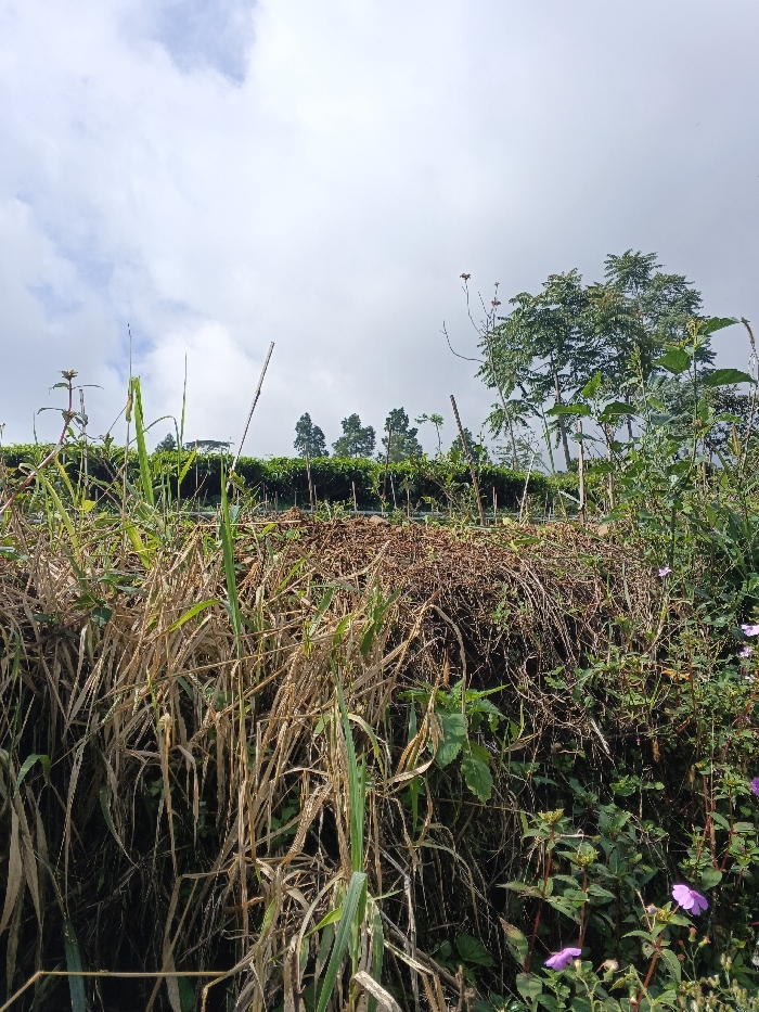 The image displays an outdoor agricultural landscape, identified as being in Wenshan City, China. The lower half of the frame is occupied by an embankment covered in dense vegetation. In the immediate foreground, a thick growth of tall, predominantly dried, yellowish-brown grasses is interspersed with patches of green weeds. Towards the lower right, multiple small, five-petaled purple flowers are visible on green foliage. Elevated beyond this foreground vegetation, a horizontal strip of uniformly green, cultivated plants, indicative of a field or plantation, extends across the middle ground. Several slender, dark-colored vertical stakes are present at irregular intervals within this cultivated area. Above the cultivated strip, a line of evergreen trees with conical shapes is visible. The upper portion of the image is dominated by an expansive, overcast sky featuring large formations of grey and white clouds. No individuals, animals, or prominent man-made structures are present within the scene.