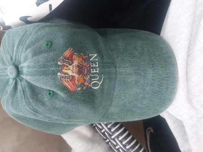 A green baseball cap is depicted in a close-up, top-down view. The cap features an embroidered emblem on its front panel, consisting of a stylized eagle with spread wings, flanked by two lions and two other animal figures (possibly crabs or scorpions), above the word "QUEEN" in white lettering. The cap's fabric appears to be a washed or faded green, with a slightly textured, possibly suede-like or distressed cotton finish. A central button is visible on the crown, along with two small ventilation eyelets on the upper front panel. The cap rests on a wrinkled white fabric surface, likely clothing. Partially visible in the background to the left is a white garment with a black geometric pattern. To the right, a darker, possibly black fabric object is partially visible. The image itself does not contain any visual cues or identifiable landmarks that would indicate a specific location within the city of Rabat, Morocco; thus, the precise urban setting is not discernible from the provided visual information.