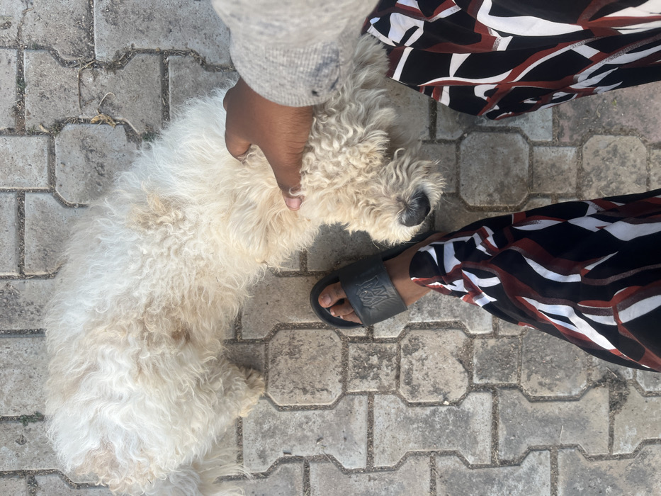 A cream-colored, long-haired dog lies on a paved surface. Part of a person is also in the image. The person is wearing black and brown patterned pants and black slides. Their hand is on the dog's neck. The paving stones are gray.