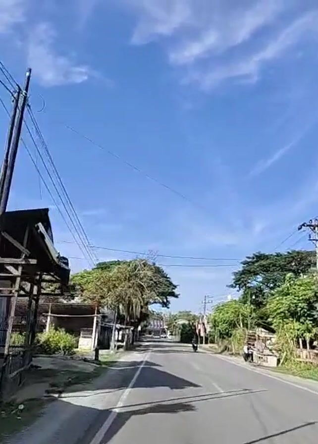 view from a vehicle driving down a paved road through a rural area. The sky is blue with some wispy clouds. Power lines run along the side of the road, supported by utility poles. On either side of the road are buildings, some appearing to be small shops or homes, and trees. One person on a motorcycle is visible, riding in the same direction as the camera, and another person is visible walking on the right side of the road. The vegetation is green, suggesting a warm climate.