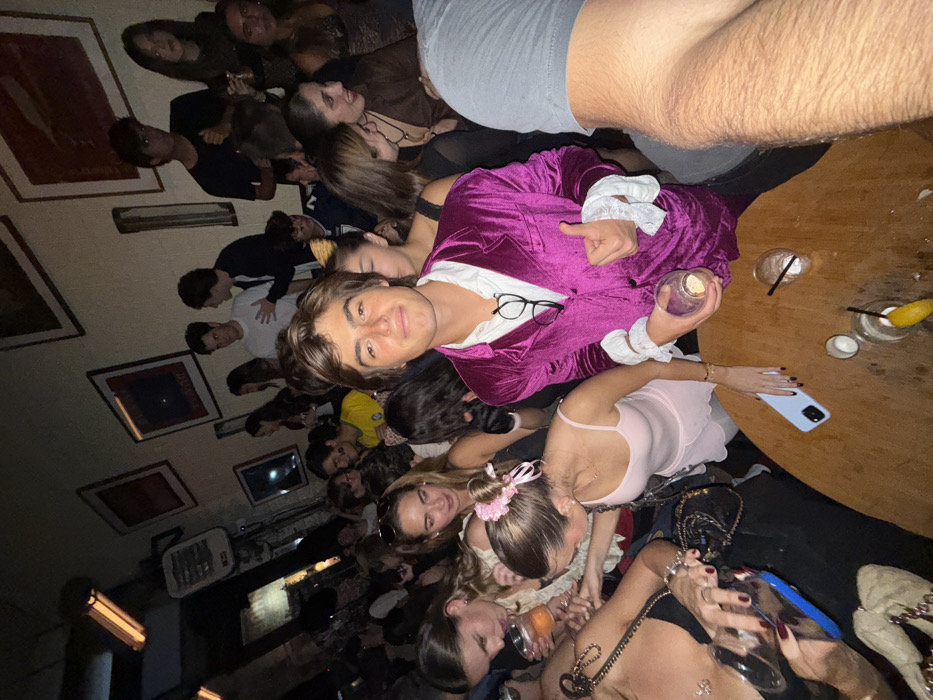 The image depicts a crowded indoor social gathering, likely a bar or nightclub in New York City, characterized by dim lighting and numerous young adults. In the foreground, a round wooden table, partially visible, displays several clear glasses with remnants of drinks, straws, and lemon slices. A light blue smartphone rests on the table. A male individual is centrally positioned in the mid-foreground, smiling directly at the camera while giving a thumbs-up gesture with his right hand. He wears a vibrant magenta velvet blazer over a white ruffled shirt with lace-trimmed cuffs. Black-framed glasses are tucked into his left blazer pocket. To his left, a female with her hair pulled back and adorned with a pink scrunchie and ribbons wears a light pink sleeveless dress; her left hand is on the smartphone. Further left, a female in a black top is holding a clear glass object and a black purse. The right shoulder and arm of another individual in a grey t-shirt are partially visible to the central male's immediate right. The background is densely populated with approximately two dozen additional individuals of varying ages, primarily young adults, who are mingling, conversing, and holding drinks. Notable figures include a person in a yellow and green shirt, possibly a sports jersey, in the mid-background. The walls are light-colored, adorned with multiple framed pictures or posters of various sizes. Two industrial-style overhead heaters with visible orange glowing elements are mounted on the left wall, above a white rectangular wall-mounted device. The environment is characterized by a high density of people within a confined space.