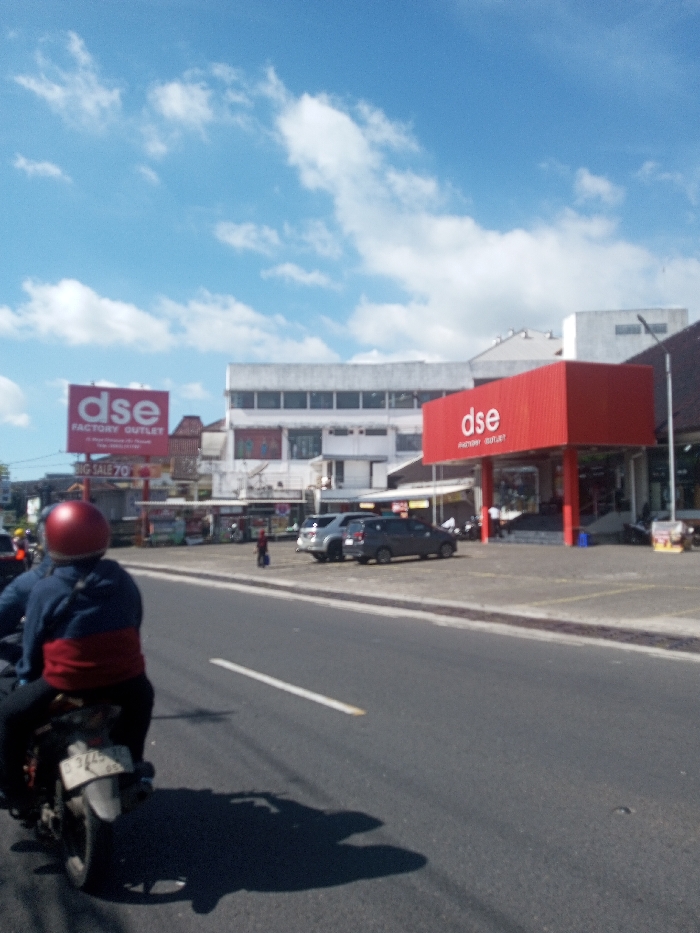 This image depicts a sunlit urban street scene in Ban Phonhxavanh, Laos, characterized by commercial activity under a clear blue sky with scattered white clouds. In the immediate foreground, the back of a person on a motorcycle is visible, wearing a red helmet and a dark blue jacket with a red lower section. The motorcycle casts a distinct shadow on the asphalt road, which features a single white dashed lane marker. To the right of the road, a large commercial building is present, featuring a prominent red entrance structure emblazoned with "dse FACTORY OUTLET" in white lettering. Two dark-colored cars are parked in an adjacent asphalt lot. Further down the street on the left, another large red billboard-style sign also reads "dse FACTORY OUTLET," accompanied by a "BIG SALE 70%" banner. Beyond these primary structures, additional commercial buildings and street infrastructure are visible. A lone individual is observed walking across the parking area near the parked cars. Other indistinct figures are visible near the building entrances. The overall environment suggests active daytime commerce.