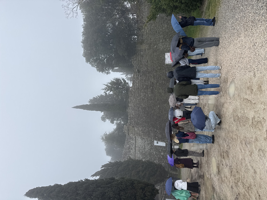 The scene depicts approximately 20-25 individuals gathered outdoors in Cortona, Italy, under rainy and foggy conditions. They stand on a wet, gravelly path with visible puddles, facing an ancient, dark stone wall constructed from large, irregular blocks. This wall, indicative of historical fortifications or Etruscan origins, extends across the middle ground. Several white informational signs are affixed to the wall on the left side. The sky is uniformly overcast and obscured by thick fog or mist, diminishing visibility of the upper background. Tall, dark cypress trees are prominent on the left and behind the wall, intermingled with other dense green foliage and trees that are partially shrouded by the mist. Most individuals in the group are young adults, dressed in casual attire and rain jackets. They are holding open umbrellas of various colors, including blue, purple, green, red, black, and patterned designs, for protection against the rain. One individual in the foreground, slightly left of center, is crouched down, holding a dark blue umbrella. The group's collective orientation suggests they are observing a point of interest or listening to a speaker.