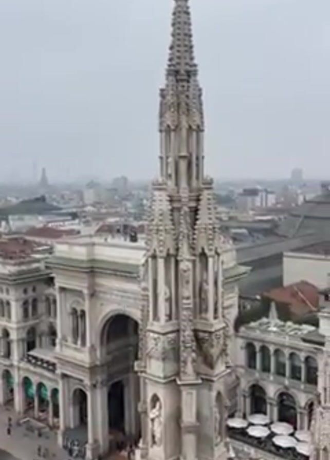 n exterior view from a high vantage point in Milan, Italy, on a cloudy day. The camera pans right, starting with a close up of a highly ornate stone spire with a statue on top. The focus shifts to a wider panorama of the city. We see the Galleria Vittorio Emanuele II archway below, various buildings with differing roof styles, and in the distance, the modern skyscrapers of the Porta Nuova district are faintly visible through the hazy atmosphere. The camera continues to pan showing more of the detailed architectural spires of the Milan Cathedral.