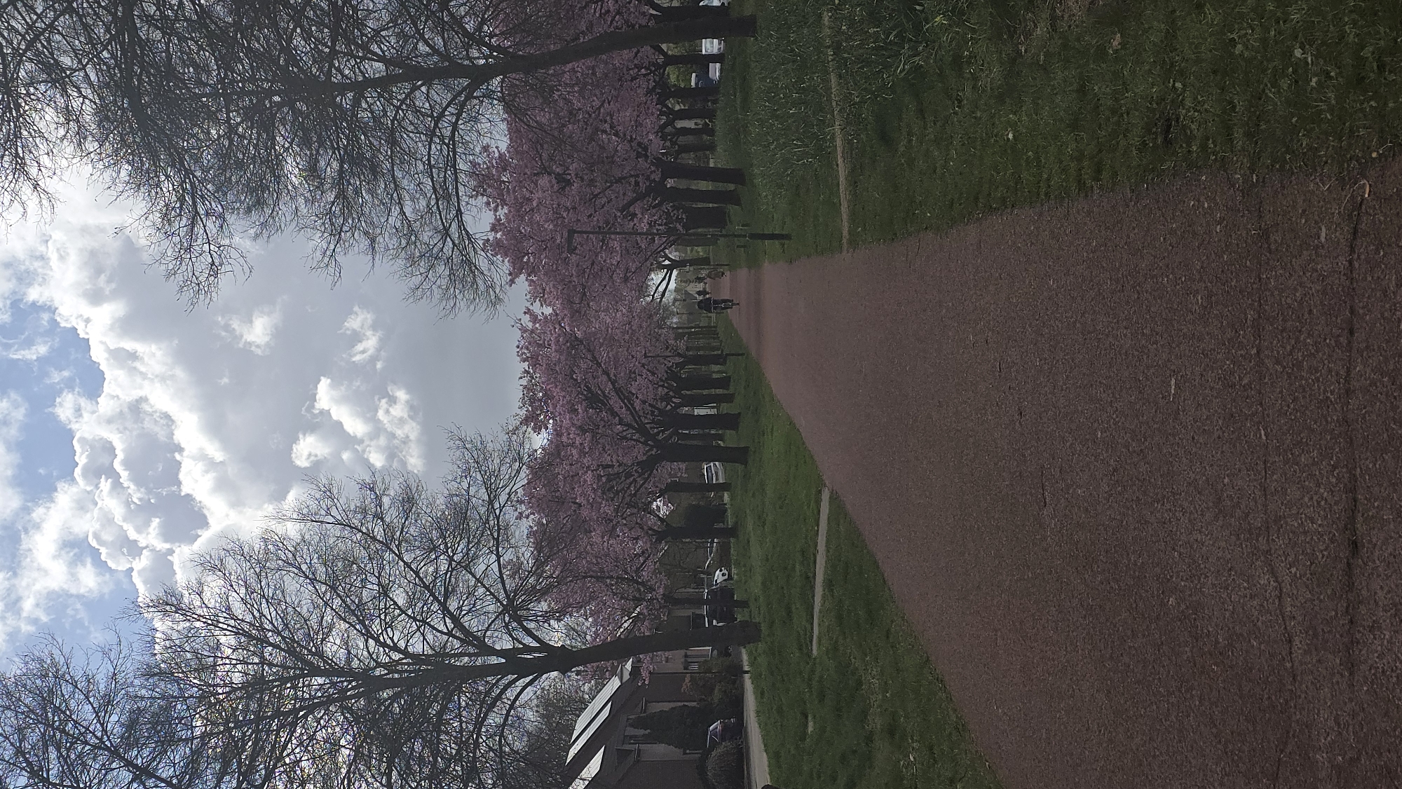 The image captures a tree-lined pathway in Helmond, Netherlands, under a partially cloudy sky. A reddish-brown paved path, likely a bicycle and pedestrian route, extends centrally from the foreground into the distant background. Green grass verges border both sides of this path. On the left, a row of residential houses with sloped roofs, some equipped with solar panels, is visible, partially obscured by trees. Several parked vehicles are present along the street fronting these houses. Framing the pathway, particularly in the mid-ground, are numerous flowering cherry trees (Prunus serrulata) exhibiting dense pink blossoms, forming an overhead canopy. Dark-poled streetlights are interspersed among these trees. Two prominent, bare deciduous trees with intricate branch structures frame the immediate left and right foreground. The sky above displays a mix of blue patches and large, white-grey cumulus clouds. In the mid-ground on the paved path, a single individual is observed cycling away from the viewer, appearing as a dark silhouette. A smaller, indistinct dark shape is visible further down the path.