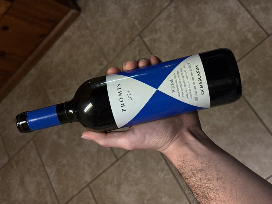 - "A hand holds a bottle of red wine, labeled "Promis 2023 Toscana"" by FM-EQHYk2, licensed under CC BY 4.0
