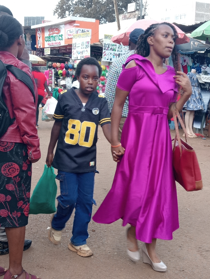 In an outdoor setting, a child wearing a football jersey and blue jeans walks alongside a woman in a vibrant purple dress and wedge heels. They hold hands as they navigate a crowded market street with various shops and pedestrians visible in the background. The child carries a green shopping bag. The woman has a red purse.