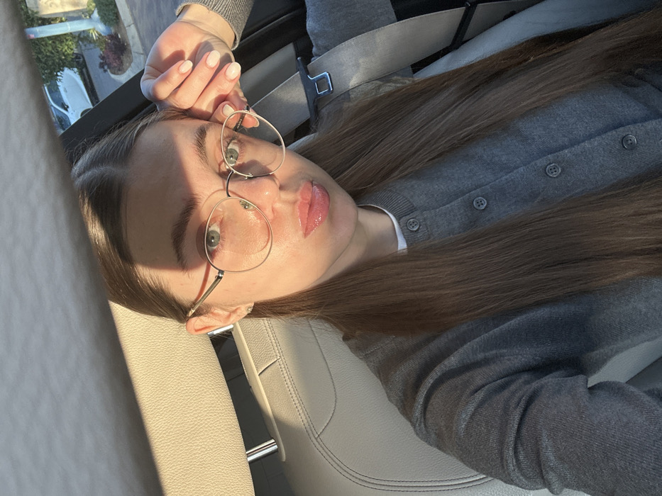 A female individual is shown in a close-up, front-facing portrait, positioned inside a vehicle. She has long, straight, medium-brown hair with a center part and wears round, thin-framed eyeglasses with clear lenses. Her eyes are light-colored, and her lips appear glossy. She wears a grey button-up cardigan over a white crew-neck top and a small, light-colored stud earring in her left ear. Her left hand, featuring short fingernails with light-colored polish, is visible resting near her left temple. A dark-colored seatbelt is fastened across her chest and shoulder. The vehicle's interior includes a light-colored (beige/cream) leather seat and headrest with metallic uprights. Strong, warm-toned sunlight illuminates the left side of her face and the car's interior, casting distinct shadows. Through the car window on the upper right, a portion of a white vehicle, green foliage, and a light pole are visible, indicating an outdoor setting. The location is Unknown, Unknown.