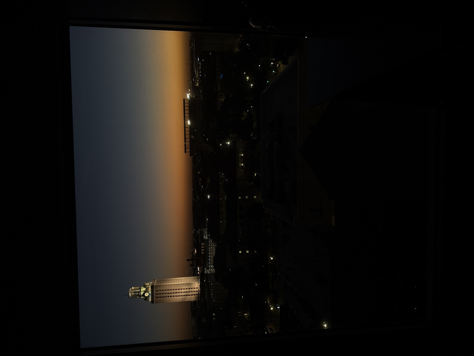 An elevated, dark urban landscape is viewed through a window at dusk in Austin, Texas, United States. The most prominent feature is the illuminated University of Texas Tower, a light-colored, multi-story structure with a clock at its upper section, positioned to the left of the frame's center. The sky transitions from a deep indigo at the top to a vibrant orange and yellow horizon line. Below the horizon, a dense collection of dark building silhouettes and scattered artificial lights from streetlights and building interiors are visible across the city. To the right, a darker, silhouetted structure with an open, skeletal upper frame is discernible against the twilight sky. The immediate foreground, comprising the lower half of the image, is heavily shadowed, showing only faint outlines of rooftops and the dark interior of the room from which the photograph was taken, including portions of a window frame on the left and right edges. No people, specific actions, or direct interactions are visible.