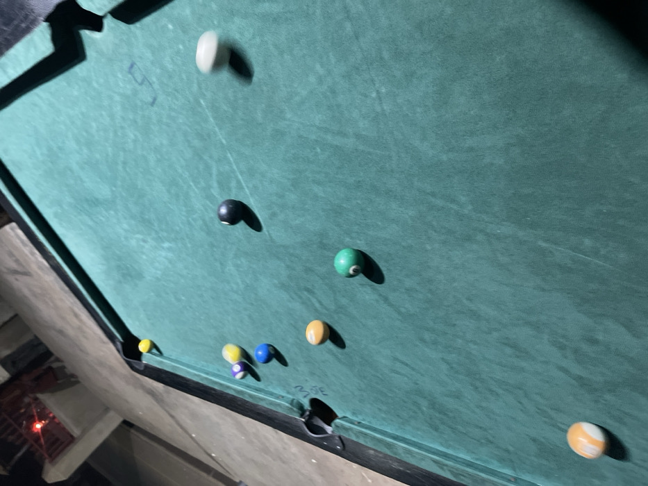 - "The image displays a partial overhead view of a green-felted pool table located in Unguwar Gabas, Nigeria, under dim artificial lighting conditions" by FM-BxNEa2, licensed under CC BY 4.0