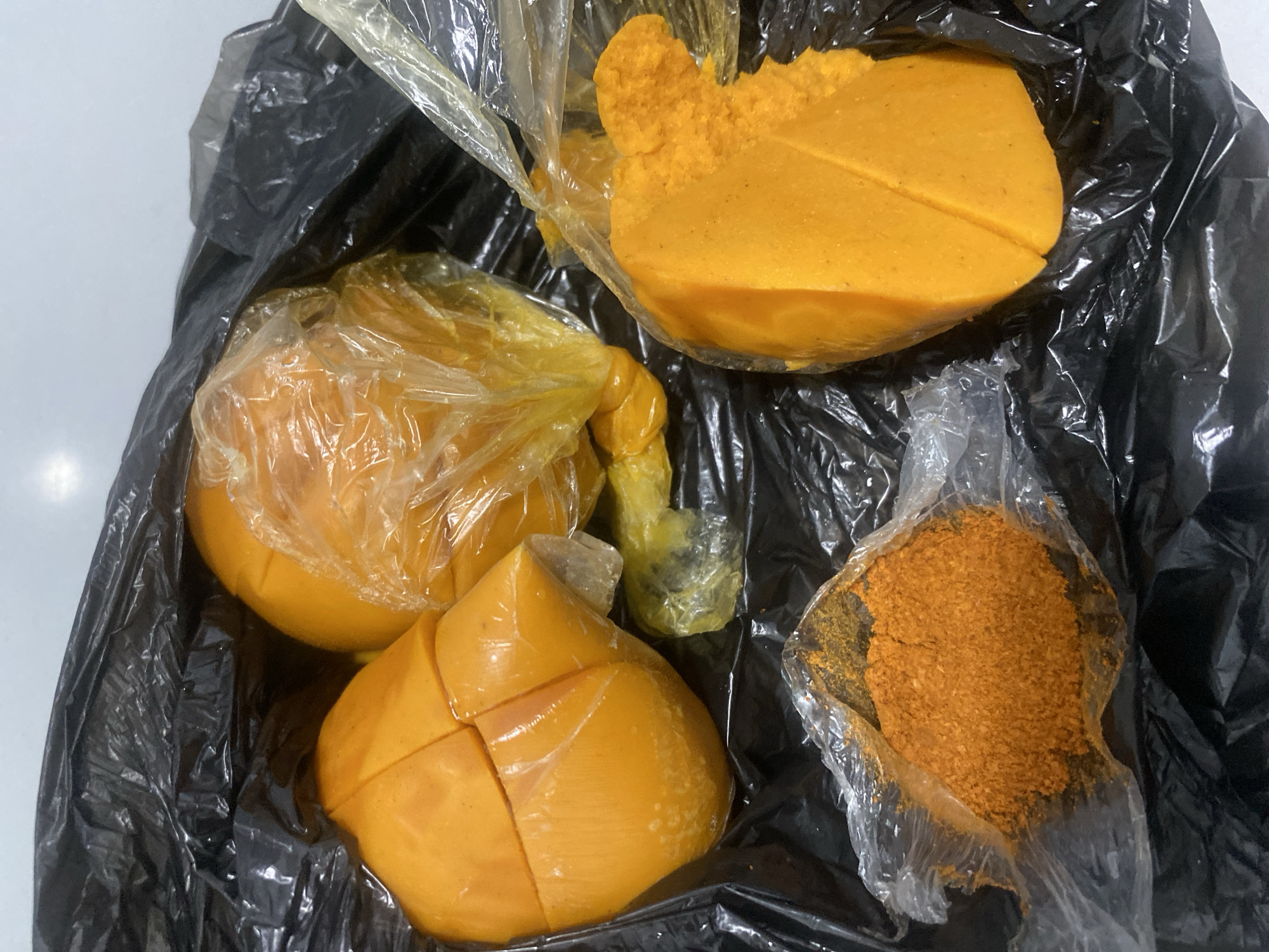 A black plastic bag is depicted containing four items, individually enclosed in clear plastic wrappings, resting on a light-colored surface. Three items are orange-yellow, semi-solid food products: one segmented, somewhat cylindrical mass; one rounded, fully-wrapped mass; and one half-circular mass showing a portion previously removed, also segmented. The fourth item is a small quantity of orange-brown granular substance, consistent with a spice or seasoning, contained in a clear plastic bag. This scene is located in the city of Dadi Riba, Nigeria.