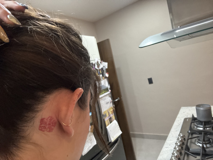 A woman's head and neck are visible in a kitchen setting. The woman's dark brown hair is pulled back, revealing a small, reddish-pink tattoo behind her left ear. She is wearing a gold hoop earring. A stainless steel refrigerator, stove, and vent hood are visible in the background. The walls are painted in a neutral tone. The lighting is bright, suggesting the presence of overhead lights.