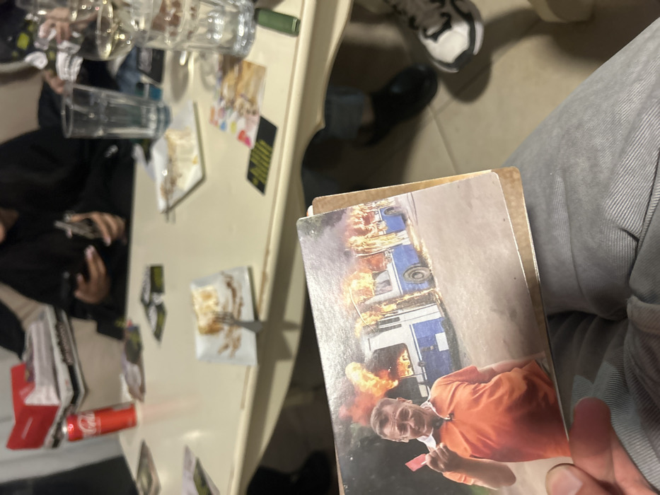 The image depicts an indoor scene in the city of Voluyak, Bulgaria, observed from a first-person perspective, where a person holds a printed photograph in the foreground, with a blurry social gathering in the background. In the foreground, a color photograph shows a man and two burning buses. The man, middle-aged with short hair and glasses, wears an orange polo shirt and exhibits a distressed expression, holding a small red rectangular object in his right hand. Behind him and to his right, two light-blue and white articulated buses are fully engulfed in flames, with visible fire and smoke emanating from windows and structural elements. The buses are situated on an asphalt road, with green foliage in the background, indicating an outdoor setting. The blurry background reveals a light-colored rectangular table at which several individuals are gathered. Visible items on the table include a red Coca-Cola can, multiple drinking glasses (some containing clear liquid), white plates with partial remnants of cake or dessert, forks, and scattered cards or game pieces. A green lighter is also present on the table. Partially visible individuals include one person on the left wearing dark clothing, holding a smartphone and another object. On the right, a foot wearing a white and black athletic shoe is visible beneath the table. The hand holding the photograph is clad in grey pants. The scene conveys a casual social interaction or game session.