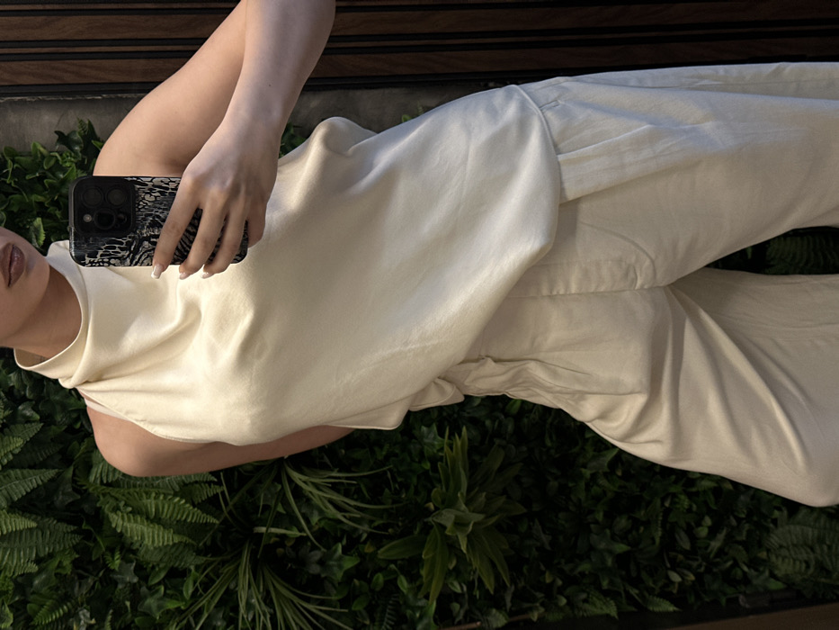 A person, partially visible from the mid-torso downwards, is depicted taking a mirror selfie in an interior location within the city of Plovdiv, Bulgaria. The individual wears an off-white, presumably satin or silk-blend, two-piece ensemble consisting of a high-neck or cowl-neck sleeveless top and matching wide-leg trousers. A smartphone, equipped with a dark, patterned case resembling reptilian skin and featuring a multi-lens camera system, is held by the right hand. The person's fingernails are painted white, and their lips, visible in the reflection, are adorned with dark lipstick or gloss. The background, as reflected in the mirror, features a dense green artificial plant wall on the left and a dark, vertically slatted wall on the right.