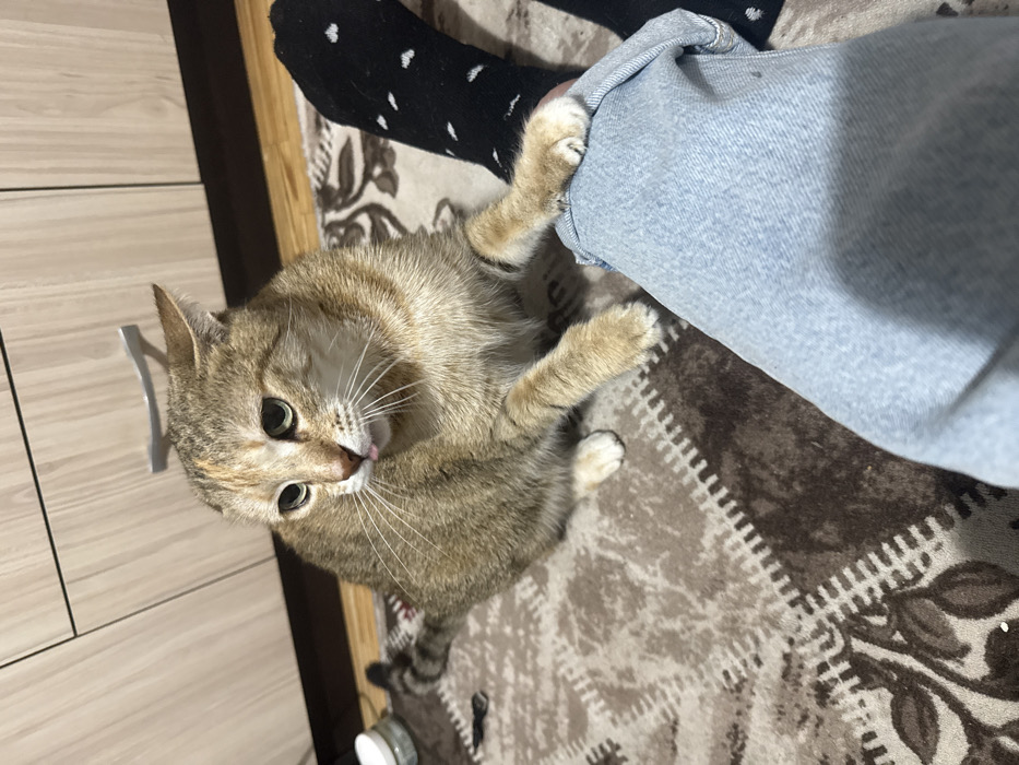 The scene is an interior view from an unspecified location within Yambol, Bulgaria. A domestic cat, predominantly tan and light brown with tabby markings, occupies the central foreground. Its eyes are light green, and its ears are slightly flattened rearward. A small portion of its pink tongue is extended from its mouth. The cat's front paws are resting on a human leg, which is dressed in light blue denim jeans. A black sock with small white polka dots is visible on the human's ankle/foot area. Both the cat and the human leg are positioned on a patterned rug or blanket featuring brown, beige, and dark brown tones with a repeating geometric and floral design. In the background, a light wood-grained cabinet or dresser with a silver pull handle is partially visible. To the immediate left of the cat, a small, clear glass jar with a white lid is present on the patterned surface. The environment is illuminated by an artificial light source.