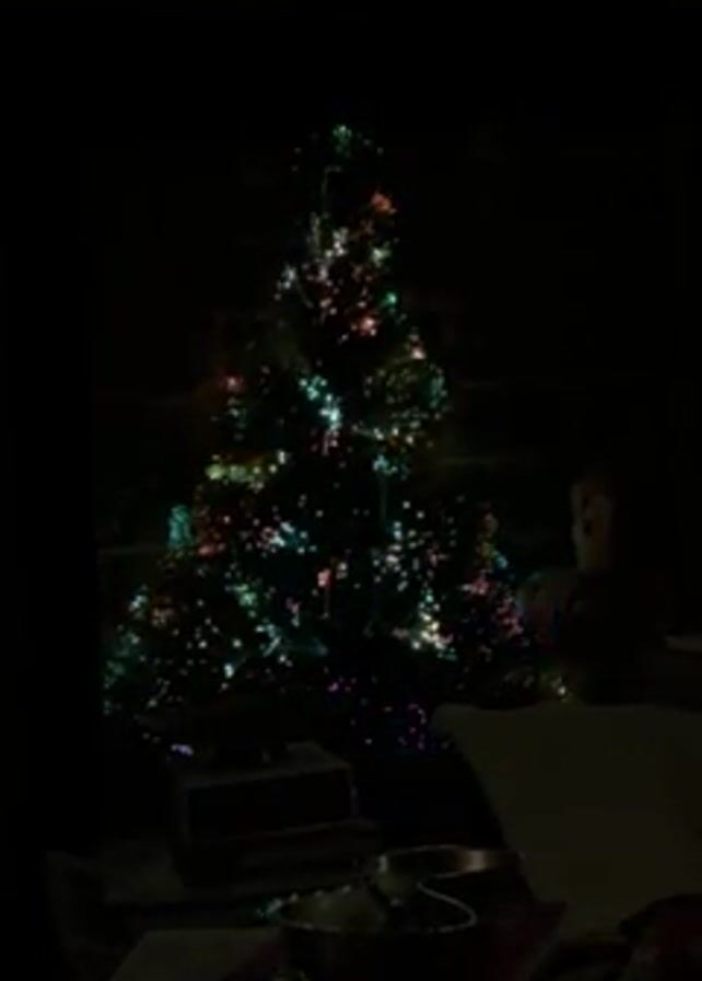 dark room. A fiber optic Christmas tree is lit with various colors. In front of the tree is a stack of books with various objects on top of them, including a clock and a metal bowl. In the background, to the right of the tree, is a statue. There is audio of someone speaking.