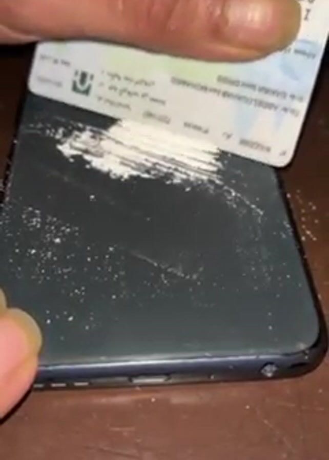 A hand is using an ID card to cut a white powdery substance into a line on the back of a black smartphone. The phone rests on a brown surface. In the background there is music.