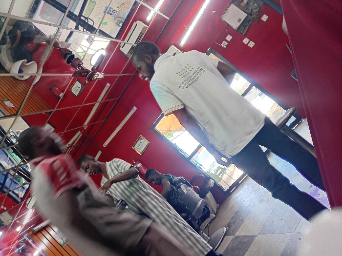 The image displays an interior scene, identified as a barbershop or salon, located in Dorayi, Nigeria