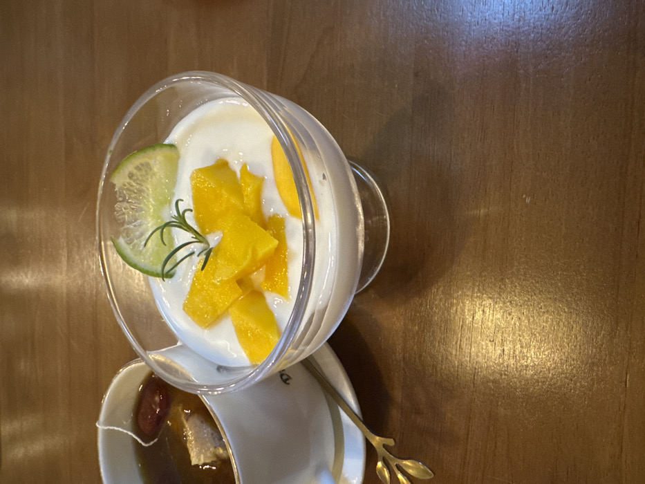 The image displays a close-up, overhead view of a dessert and beverage situated on a dark brown wooden table in Buôn Ma Thuột, Vietnam. A clear glass dish, positioned centrally, contains a white, creamy substance, likely a yogurt or pudding, adorned with numerous irregular diced pieces of bright yellow mango, a thin green lime wedge, and a small sprig of green herb (possibly rosemary). To the left, partially cropped, a white ceramic cup with a gold rim and faint dark lettering contains a dark amber liquid, presumed to be tea, with a white tea bag string visible over the rim, along with a reddish-brown fruit (possibly a dried jujube) and another lighter ingredient submerged. This cup rests on a white ceramic saucer, also featuring a gold rim, on which a small, gold-colored metallic spoon with an ornate leaf-shaped handle is placed. The wooden table surface exhibits a visible grain pattern and reflects overhead lighting. No individuals are present, and no active interactions or actions are depicted within the scene.