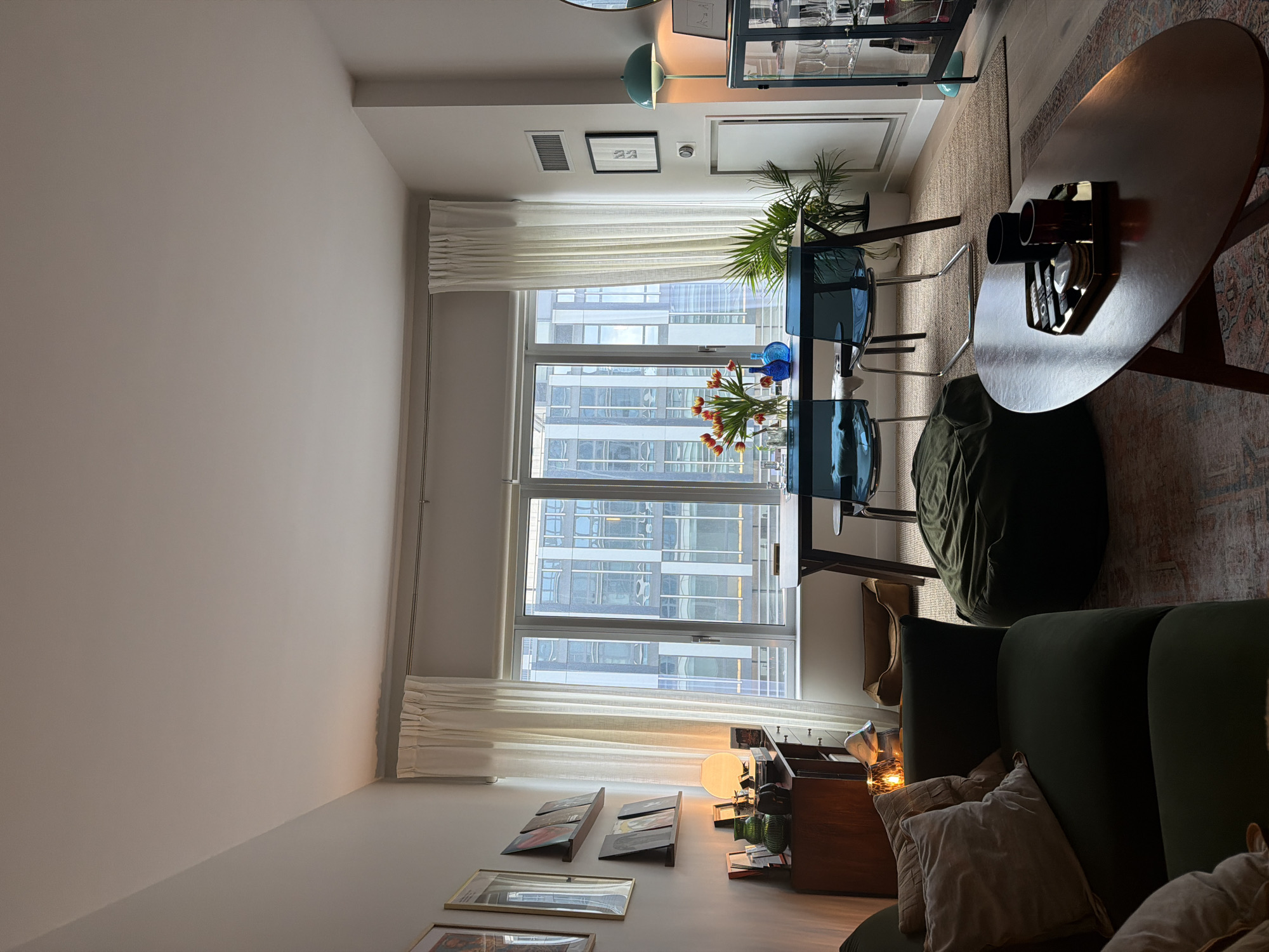 The image depicts the interior of a contemporary apartment located in New York, United States of America. No individuals are visible within the scene. The room functions as an open-concept living and dining area, illuminated by natural light from large windows and warm artificial lighting. Through the expansive windows, multiple modern high-rise buildings with reflective glass facades are visible, characteristic of a dense urban environment. Sheer white curtains are drawn across the windows. A dark rectangular dining table is positioned in front of these windows, furnished with a clear vase containing orange tulips, two blue glass vases, and glassware. Two transparent blue chairs with chrome frames are situated at the table. A light-colored jute rug lies beneath the dining area. To the left of the dining area, a dark green velvet sofa with several light-colored throw pillows occupies the foreground. A dark green bean bag chair rests on the floor between the sofa and the dining table. An oval dark wood coffee table is positioned on a patterned rug in front of the sofa, holding a gold-colored tray with remote controls, coasters, and cups. Along the left wall, framed artwork is displayed above two floating shelves that hold records or books. Below these shelves, a wooden credenza supports a spherical lamp, green glass vases, and other decorative items. A tan pet bed is visible on the floor near the window. On the right side of the room, a tall, dark display cabinet with glass doors stores glassware and bottles. Adjacent to this cabinet, a teal-colored floor lamp with an inverted bowl-shaped shade stands. A partial view of a round mirror and a framed picture are on the wall above the cabinet. A wall-mounted HVAC vent, a thermostat, and a white panel or door are also present on the right wall. A potted palm-like plant is located between the dining table and the right wall.