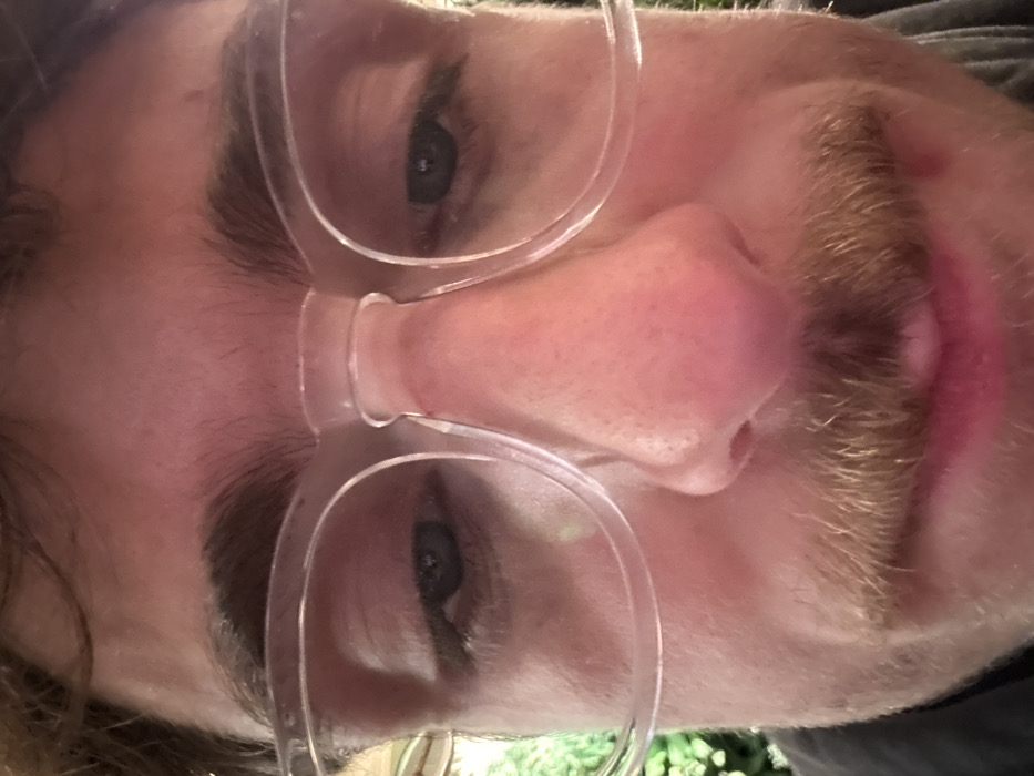 A close-up, tilted selfie of a person with fair skin, brown eyebrows, and blue eyes. The person is wearing clear-framed glasses. A blonde mustache is visible above the upper lip. The camera angle offers a slightly upward view of the face, emphasizing the nose and glasses. A hint of greenery is at the bottom right of the frame, suggesting an outdoor setting.