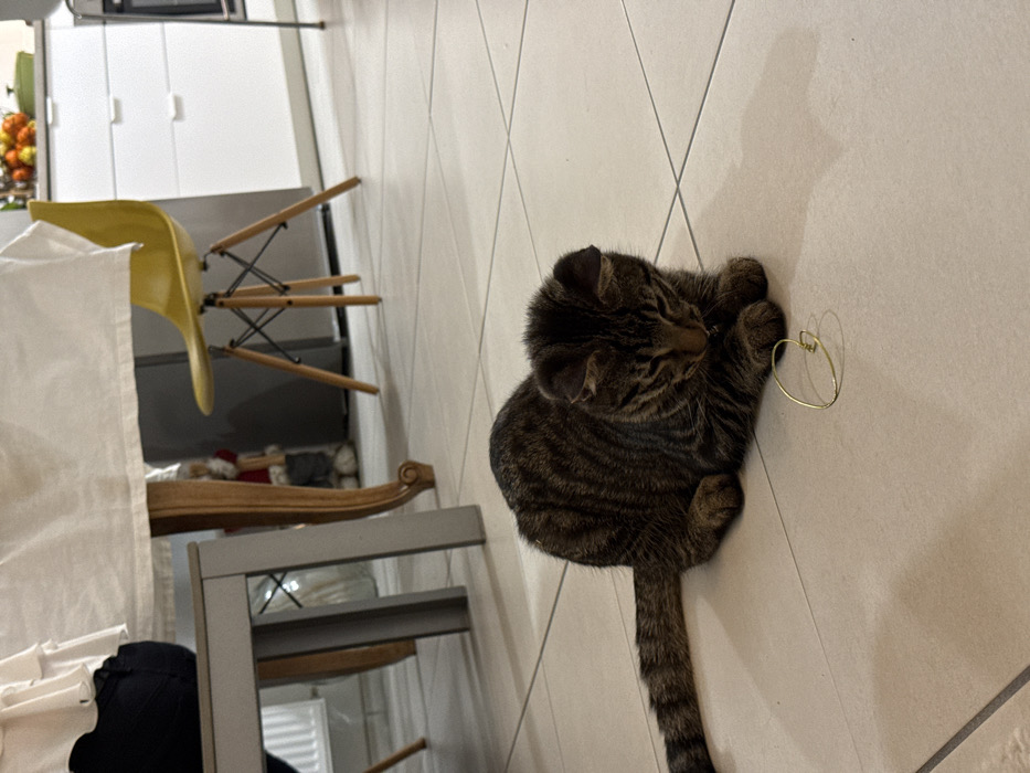 - "A tabby cat curls up on a tile floor, paws near a golden, heart-shaped wire" by FM-CYJaF3, licensed under CC BY 4.0