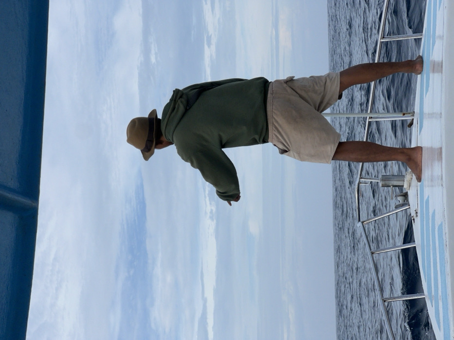 A person in an olive green hoodie, khaki shorts, and a tan fedora stands on a boat. The person leans over the side pointing down towards the water. Part of the boat's blue structure is visible on the left, and the ocean is on the right. The sky is light blue with wispy white clouds. Metal railings run along the edge of the boat.