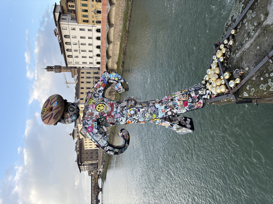 A stylized, humanoid statue stands on a stone parapet overlooking the Arno River in Florence, Italy