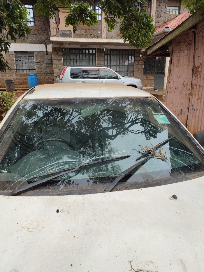 The image displays an outdoor scene in Ngong ward, Kenya, featuring the front portion of a white vehicle in the immediate foreground. The vehicle's hood and upper body are extensively covered in dust and dirt, with visible cracking and wear on the white paint. The windshield is severely damaged, exhibiting numerous radial cracks originating from multiple impact points across its entire surface. Both black windshield wipers are positioned on the shattered glass, with organic debris, consistent with dry leaves or small twigs, resting on the passenger-side wiper and adjacent glass. A light green rectangular sticker is affixed to the upper right corner of the windshield. In the mid-ground, behind the foreground vehicle, a silver SUV, identifiable as a Nissan X-Trail by its design, is parked facing left. The SUV appears relatively clean. The background consists of two distinct buildings and dense tree foliage. To the left, a two-story structure constructed from rough-hewn stone blocks features multiple windows with dark security bars. A blue plastic barrel and a darker, cylindrical container are situated at the base of this building. To the right, a smaller, single-story structure with a faded reddish-brown corrugated metal exterior and a sloped, tiled roof is visible. A dark doorway at its base has a pair of dark open-toed footwear placed on the ground immediately outside. Lush green tree branches and leaves are visible both above and reflected in the damaged windshield. No individuals are present in the scene.