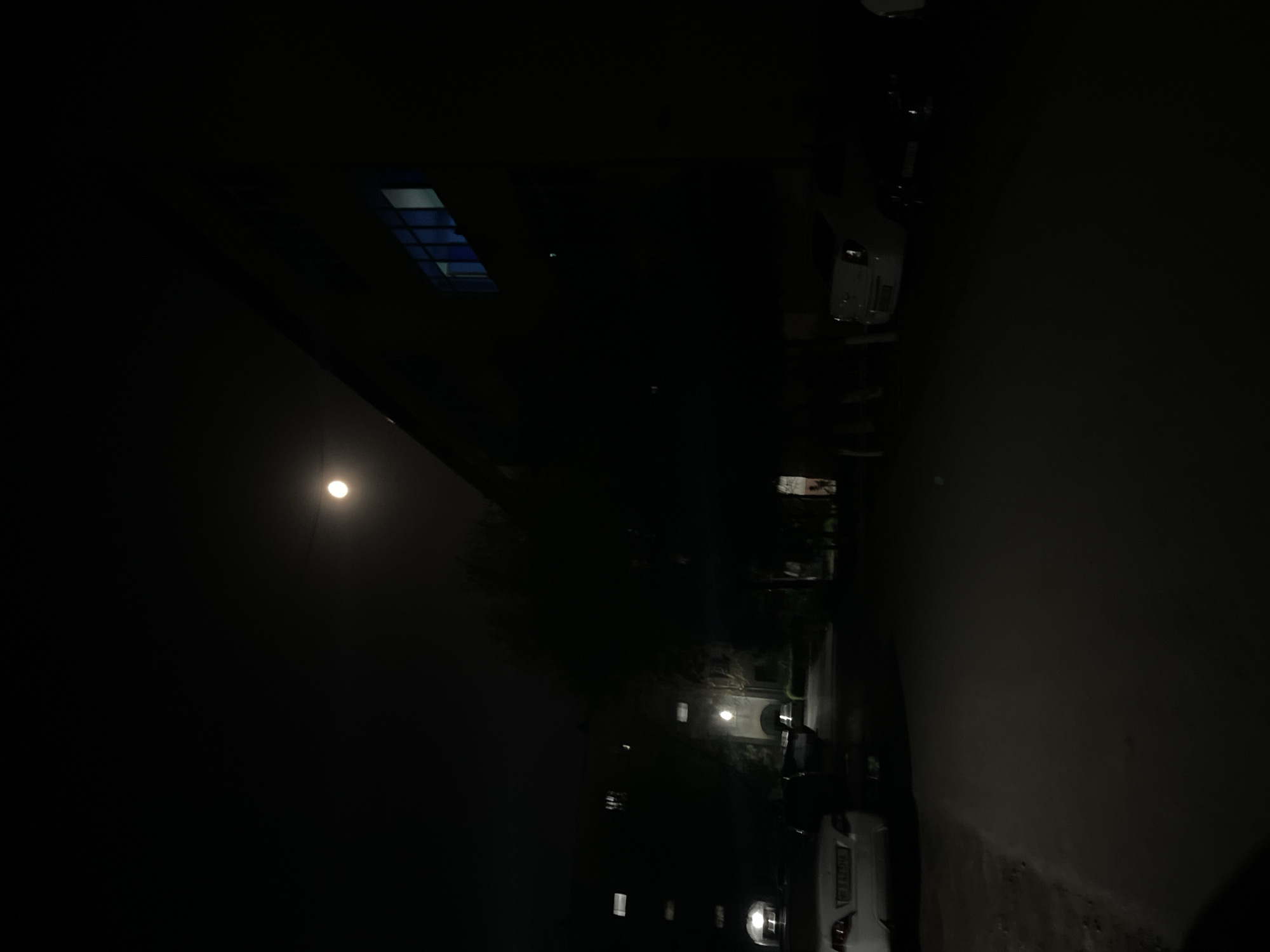 The image depicts a dimly lit street at night in what appears to be a residential area