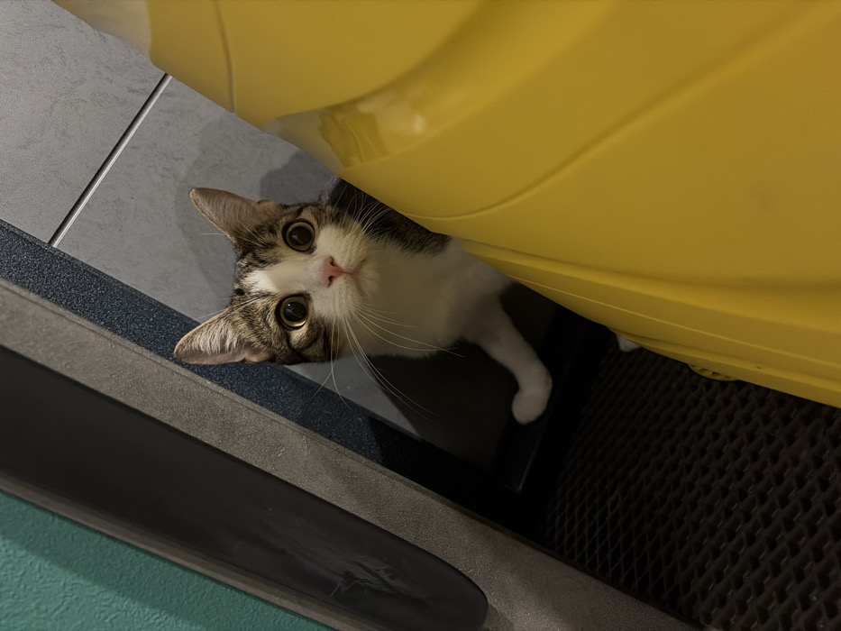 - "A tabby and white cat is positioned between a bright yellow, curved object on the right and a darker grey vertical structure on the left" by FM-9p8ld2, licensed under CC BY 4.0