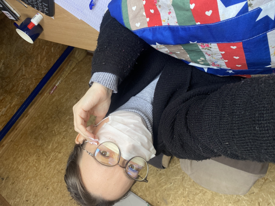 In an interior setting within the city of Ol'khovskoye, Russia, a female individual is captured in an angled close-up. She is wearing round-framed glasses, a light-colored disposable face mask covering her mouth and nose, a grey turtleneck sweater, and a black, pilled cardigan. Her right hand is raised, with fingers adjusting the mask's ear loop near her right ear. Her left eye is visible, looking towards the camera. To the upper right, a wooden desk surface holds a dark blue ceramic mug, a white bottle with a red cap, a black computer keyboard, and papers with writing, alongside a blue pen. The background features walls constructed from light-colored oriented strand board or plywood, with a blue pipe or conduit running horizontally across the upper section. A colorful, quilted item with red, white, blue, green, and brown patterned fabric squares is visible in the lower right, and a light brown cushioned object is partially seen in the lower left.