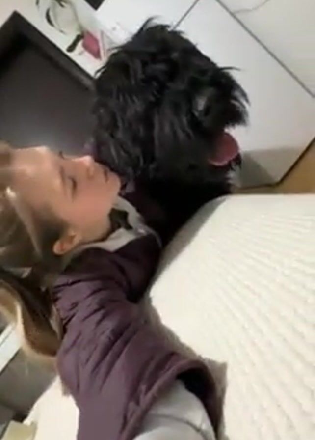 A young woman with blonde hair in a ponytail is lying on a white bed, holding a mobile phone and recording herself with a black, large dog. The dog is standing close to her, panting with its tongue out. The woman turns her head and presses her face against the dog's head in a hugging motion. The room appears to be a small apartment or studio with a microwave and a small refrigerator visible in the background. There's also a dark-colored door and a green plant on a shelf.
