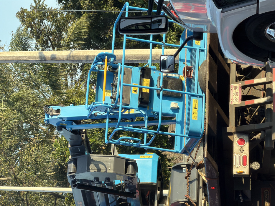 A blue boom lift sits atop a flatbed truck, positioned against a backdrop of trees and sky