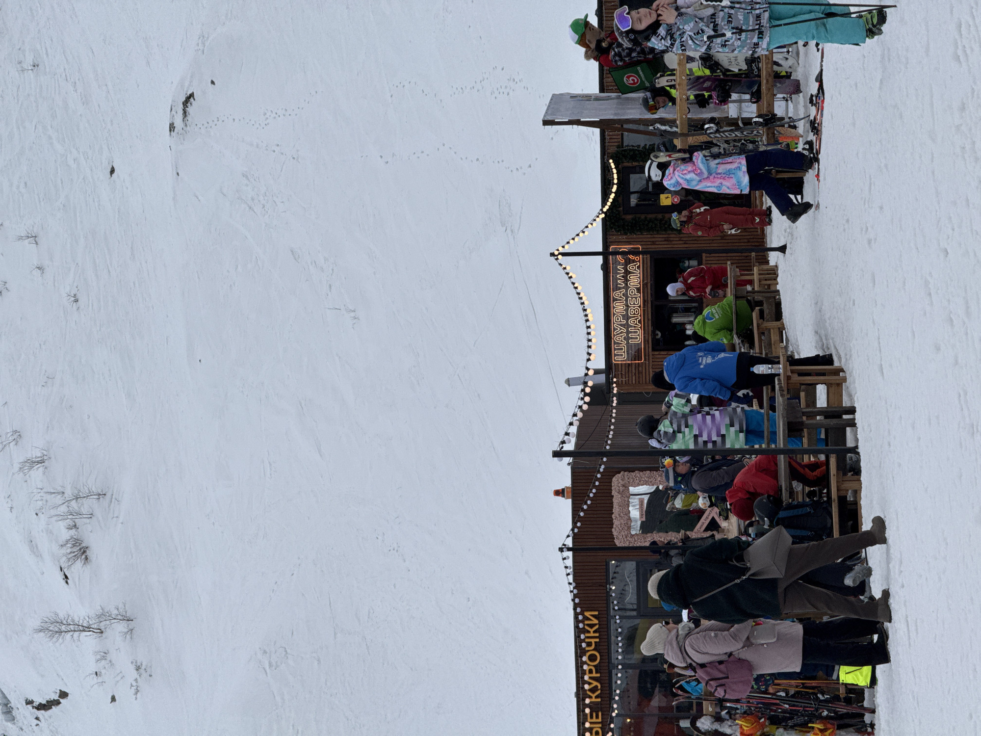 The image depicts a snowy outdoor scene at a ski resort in Kirovsk, Russia. A wooden building serves as a food vendor, with lighted signs in Russian visible. People, many dressed in ski apparel, are seated at tables, likely taking a break. Skis are stacked near the building. The surrounding environment is covered in snow, suggesting a winter setting in a mountainous region. Animal tracks lead up the mountain.